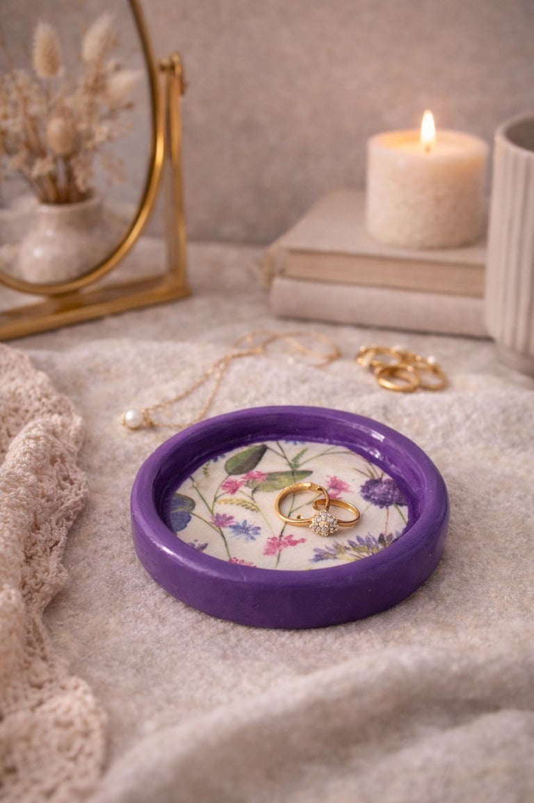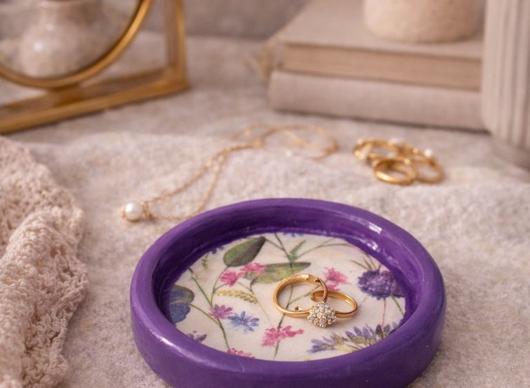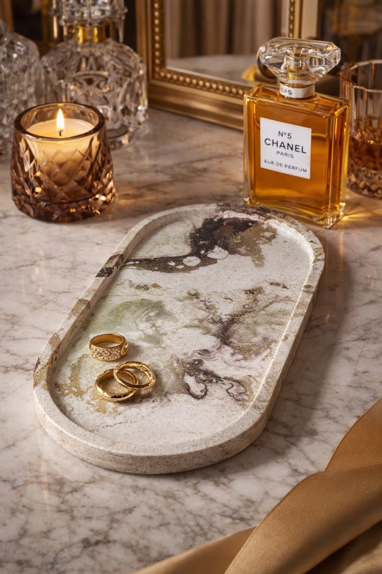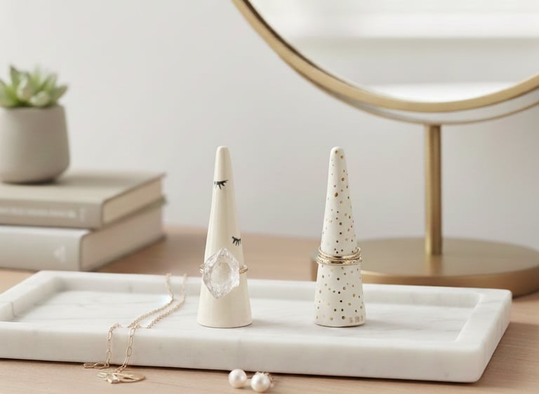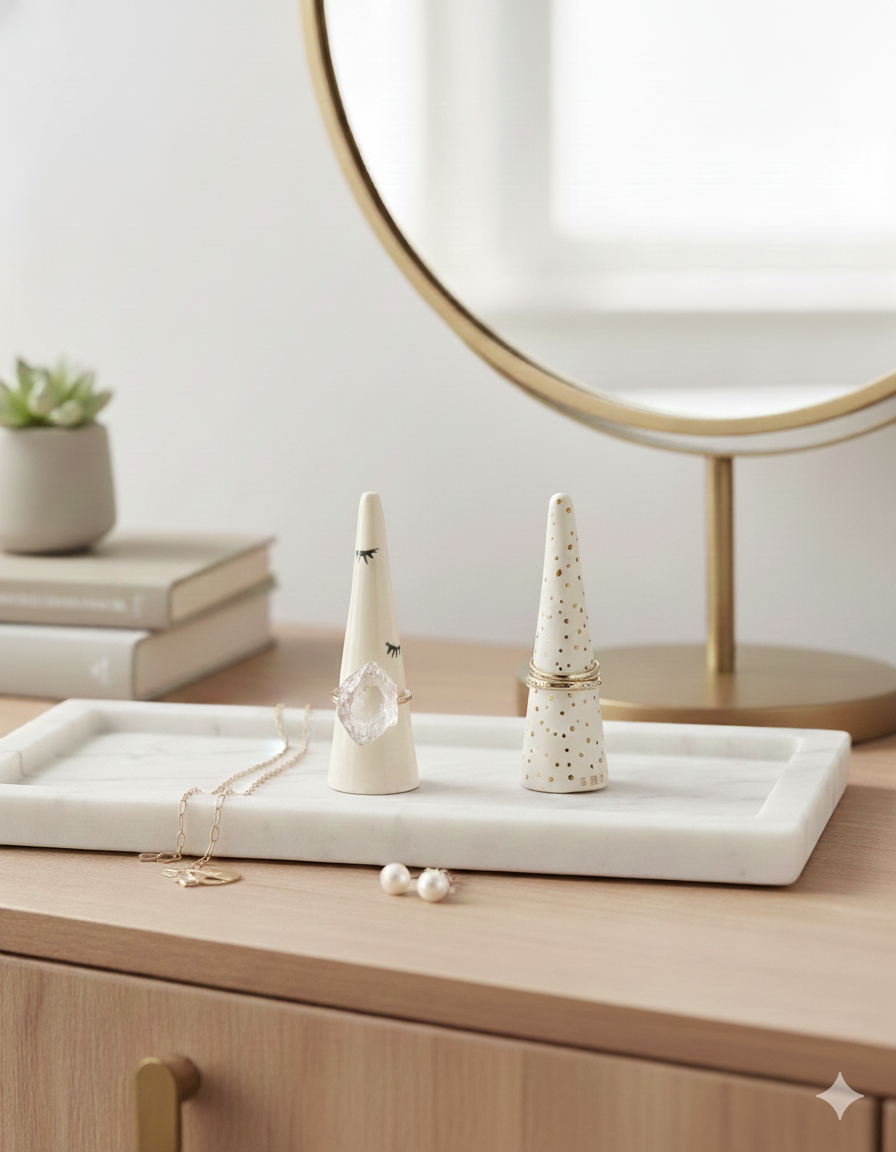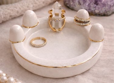 Aqui você encontra: porta-anéis, porta-joias e bandejas de apoio.