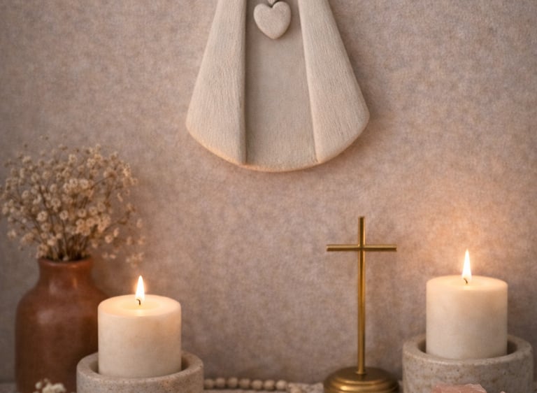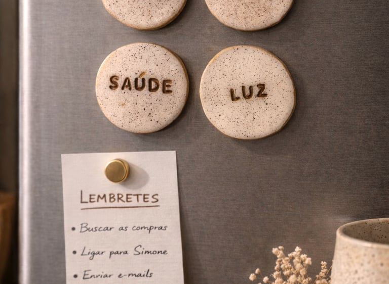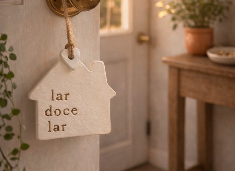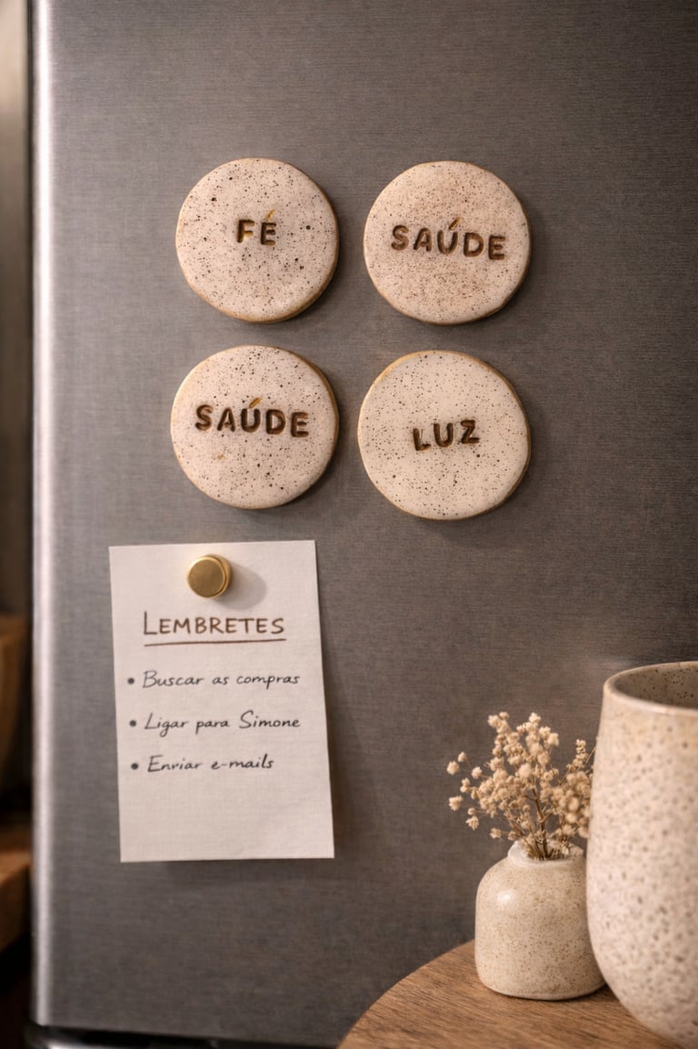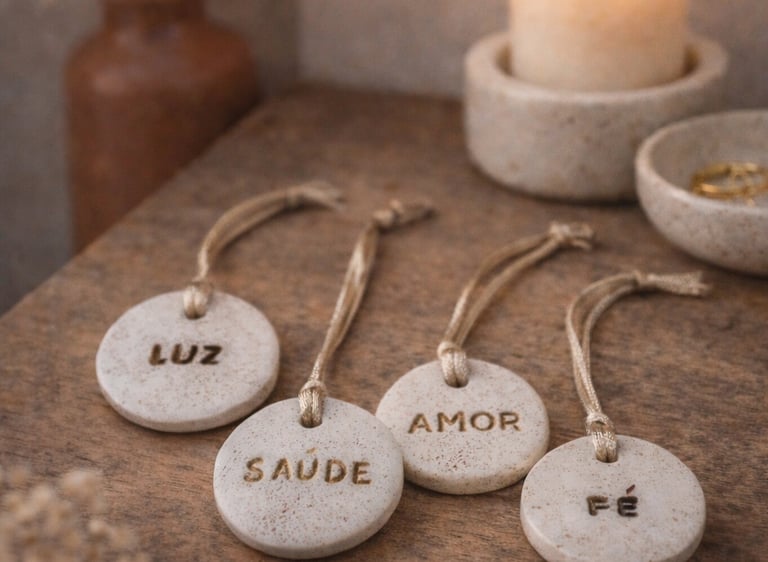 Elementos com palavras como Amor, Fé, Luz, Presença, Saúde, Família, moldadas uma a uma, com as mãos e o coração. São pequenos lembretes do que realmente importa: não para enfeitar, mas para ancorar. Feitas em cerâmica fria e repletas de intenção, essas peças não decoram: elas invocam.