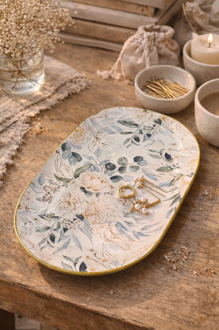 Aqui você encontra: porta-joias florais, bandejas com impressão vegetal, mini vasos e peças botânicas.